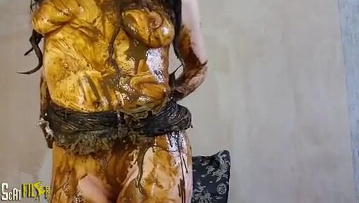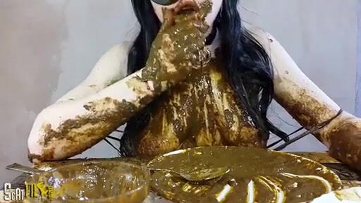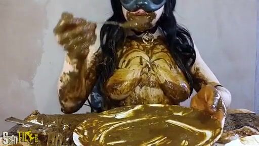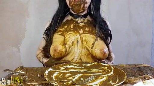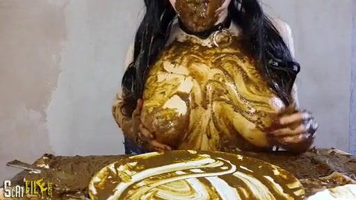 Brunette girl smearing shit heavily on her boobs