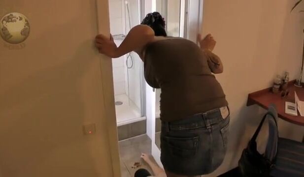 Woman squats and takes a huge shit on the floor next to a man