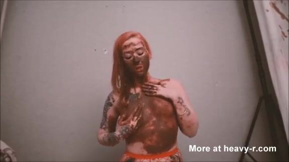Redhead tattooed slut smearing shit and sucking cock