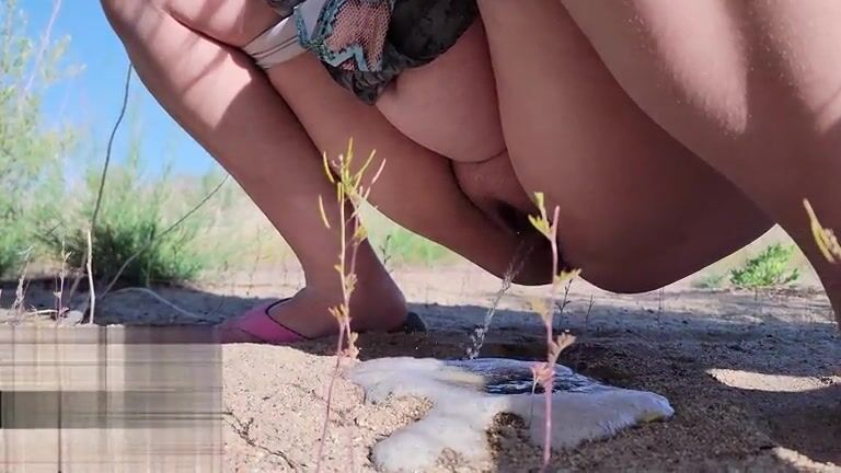 Chubby lady peeing in the nature