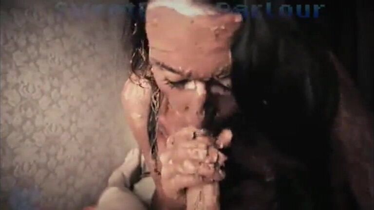 Brunette shit covered babe sucking cock