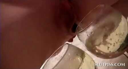 Kinky blonde tramp filling three glasses with her shit