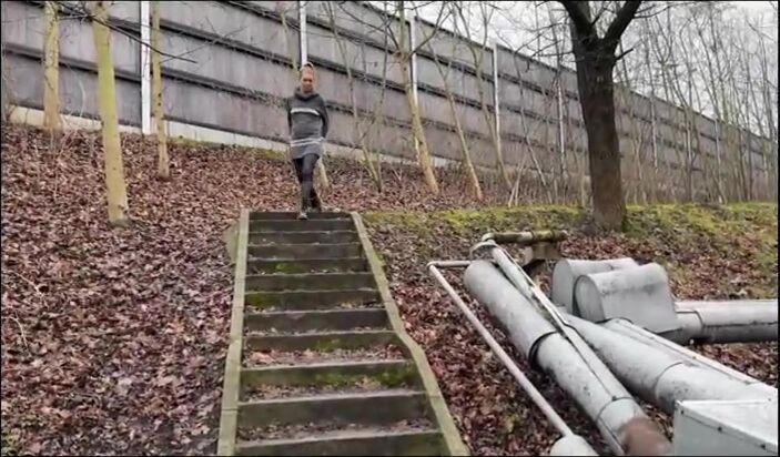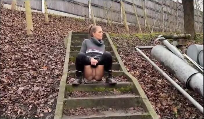 Cute looking blonde girl pissing outdoor
