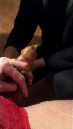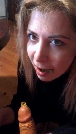 Woman squatting over a plate of shit, kissing it, drinking piss