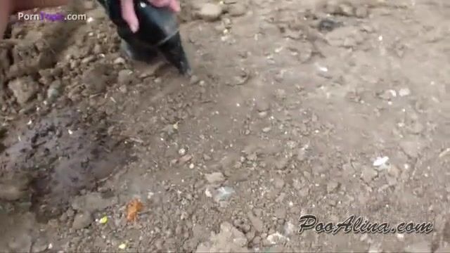 Girl squats and drops a pile of shit outside