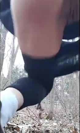 Woman squats and shits in a field