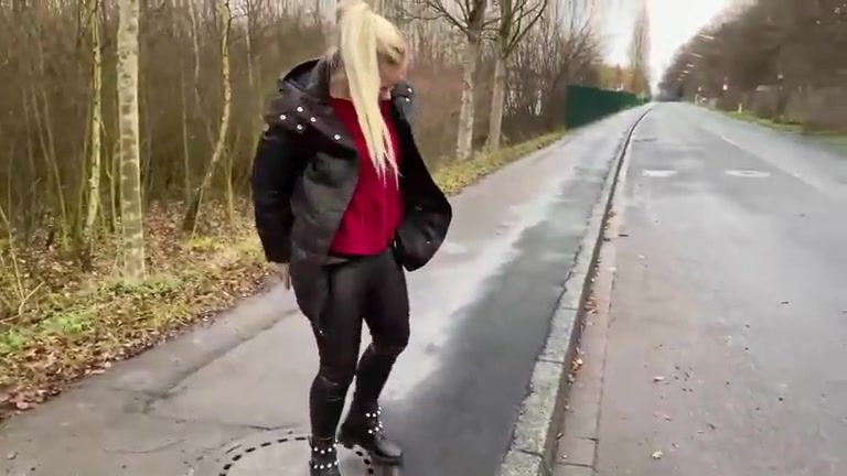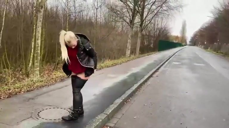 Beautiful blonde babe poops by the road side