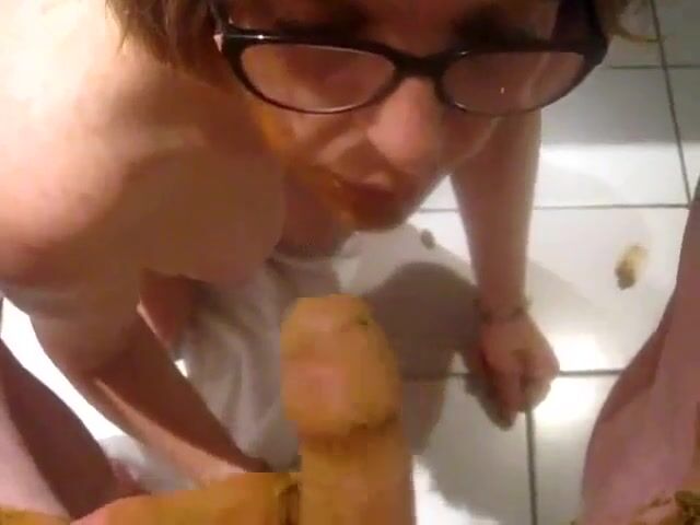 Nerdy slut sucking dirty shit covered cock