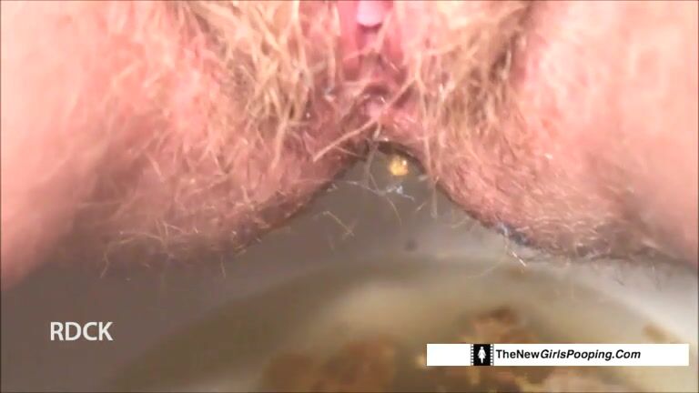 Hairy pussy lady poops in closeup