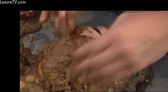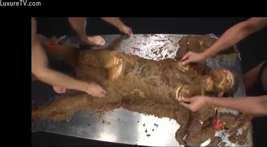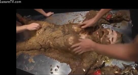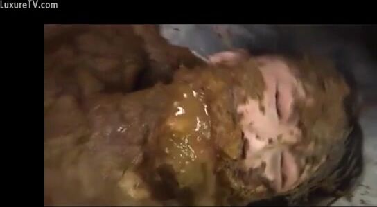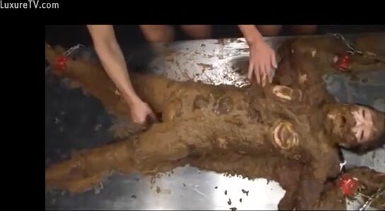 Naughty busty Asian covered heavily in wet shit