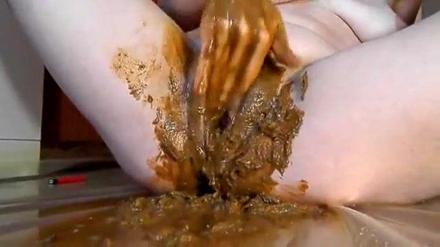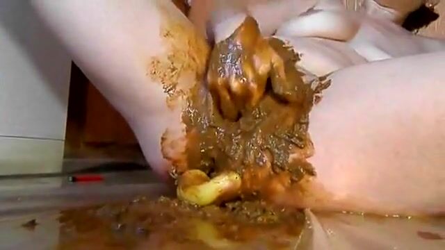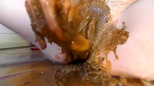 Rubbing shit on her pussy while toying her pooper