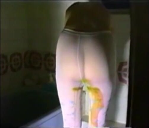 Woman shitting liquid poo in white pantyhose
