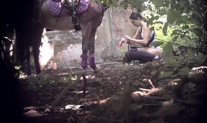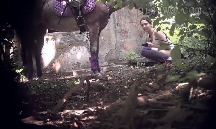Chick pooping with horse