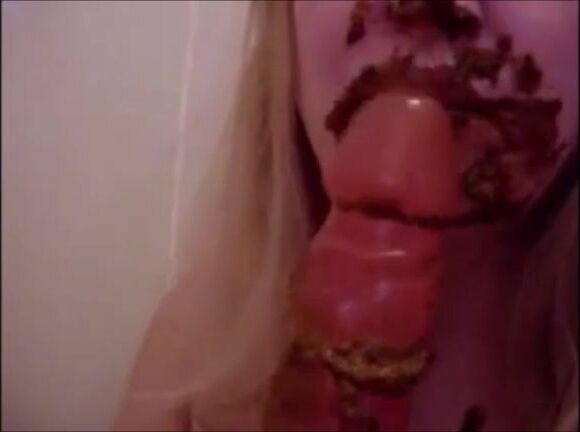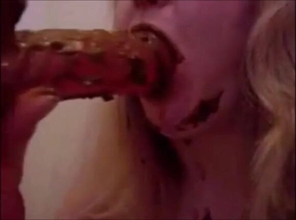 Hot blonde girl gives blowjob to a dirty dildo
