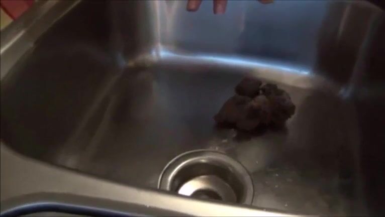 Nasty brunette shitting in the kitchen sink and pooping