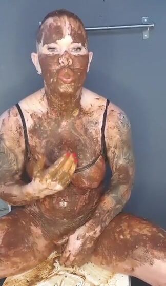 Dirty mature lady smearing shit on her body